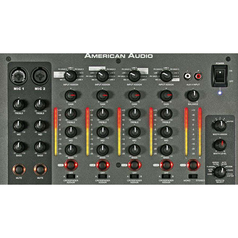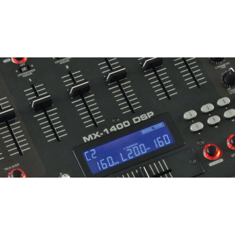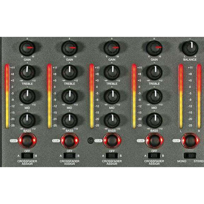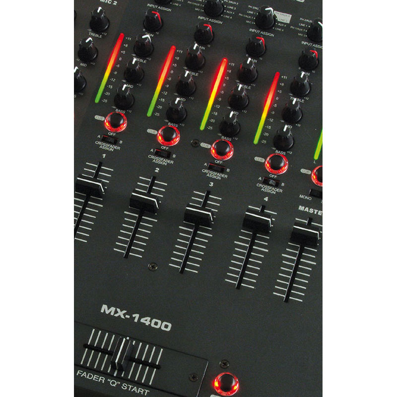 4-channel, 14-inch professional mixer , 3 Phono, 4 Lines, 4 Aux, 3 Mics (assign to any channel)