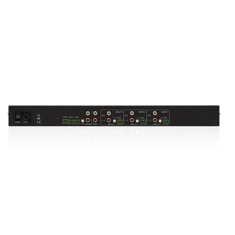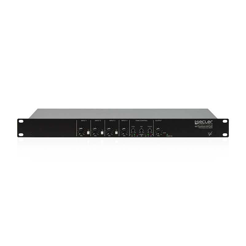 ECLER ESSENTIALS eSAM402 is an installation audio mixer in standard rack format, featuring 3 MIC/LINE ST inputs, 1 LINE ST input, 1 main mix output and one AUX/REC additional output