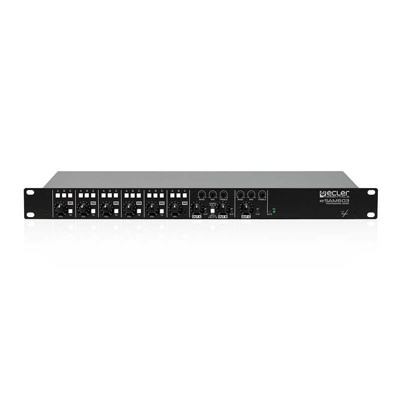 ECLER ESSENTIALS eSAM603 is an installation audio mixer in standard rack format, featuring 1 MIC input, 4 MIC/LINE ST inputs, 1 LINE ST input, 1 ST output (A/B) and 1 MONO output (C). A/B output can operates in ST/MONO mode.
