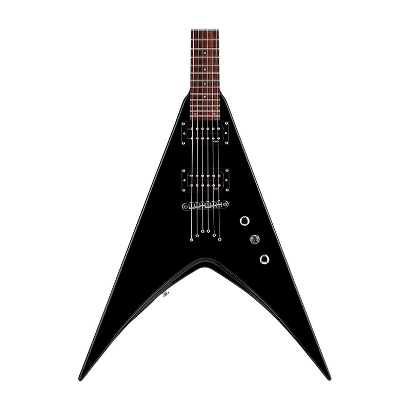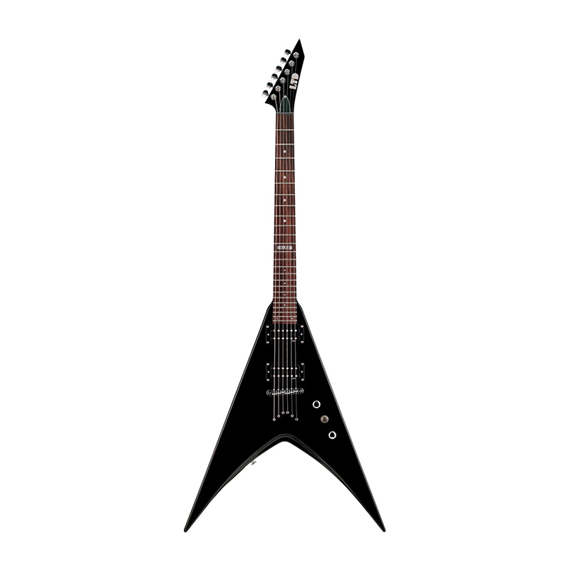 This ESP LTD V-50 electric guitar has a basswood V-shaped body with a bolt-on, thin-U maple neck. The rosewood fingerboard with 24 extra jumbo frets promotes plenty of fleet-fingered pyrotechnics. The Tune-O-Matic style string-thru bridge is fully adjustable to suit your playing preferences. A toggle pickup selector controls dual fire-breathing ESP LH-150 humbucking pickups.