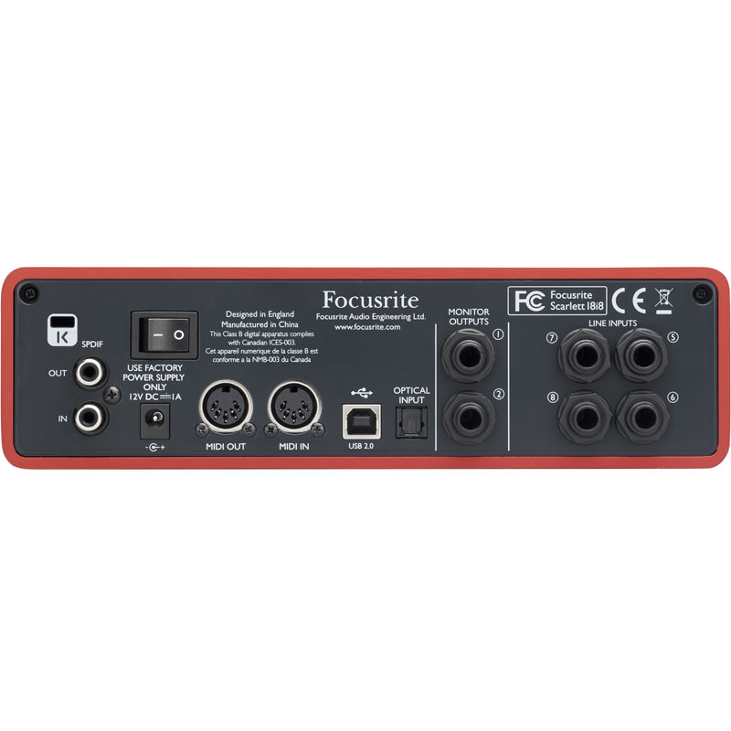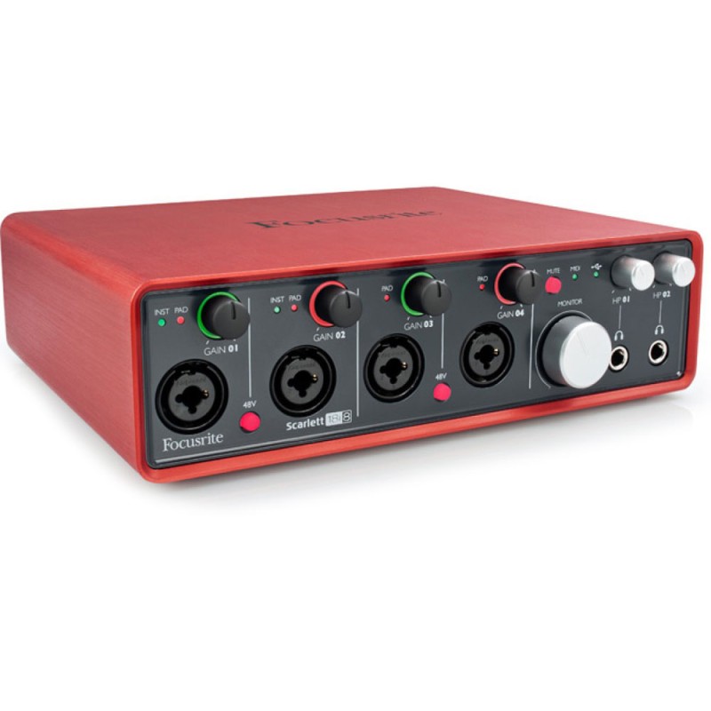 USB 2.0 Audio Interface, 18-in/6-out, with 4 x Microphone/Instrument Preamplifiers, 24-bit/96kHz, Metal Unibody Chassis, and Focusrite Scarlett Plug-in Suite - Mac/PC