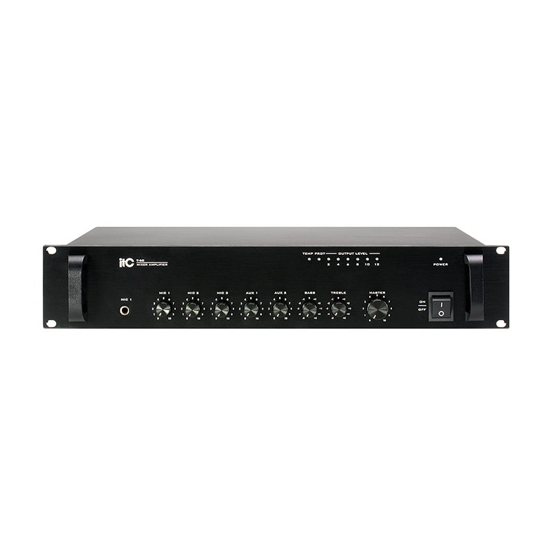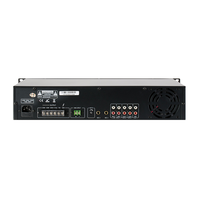 The basic public address mixer amplifier. It is featured of 3 microphone inputs, 2 aux inputs and 1 EMC input.