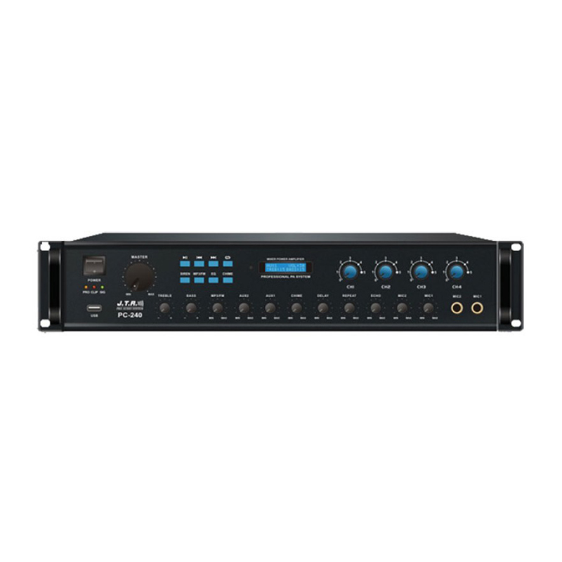 With MP3 player, support MP3 and WMA Tuner (AM&FM) function Chime and Siren function 3 AUX inputs, 2 MIC inputs, 1 AUX output MIC1 has priority (auto mute function) LED display for power, signal, clip Individual control for MIC and AUX input Master volume control Bass and treble control 70V, 100V and 8 ohms output Four zones output with separated volume control 4 loop play modes for MP3 player, 5 sound effects for user to choose Music name, played time, remain time display, EQ display. Remote control and stand by function