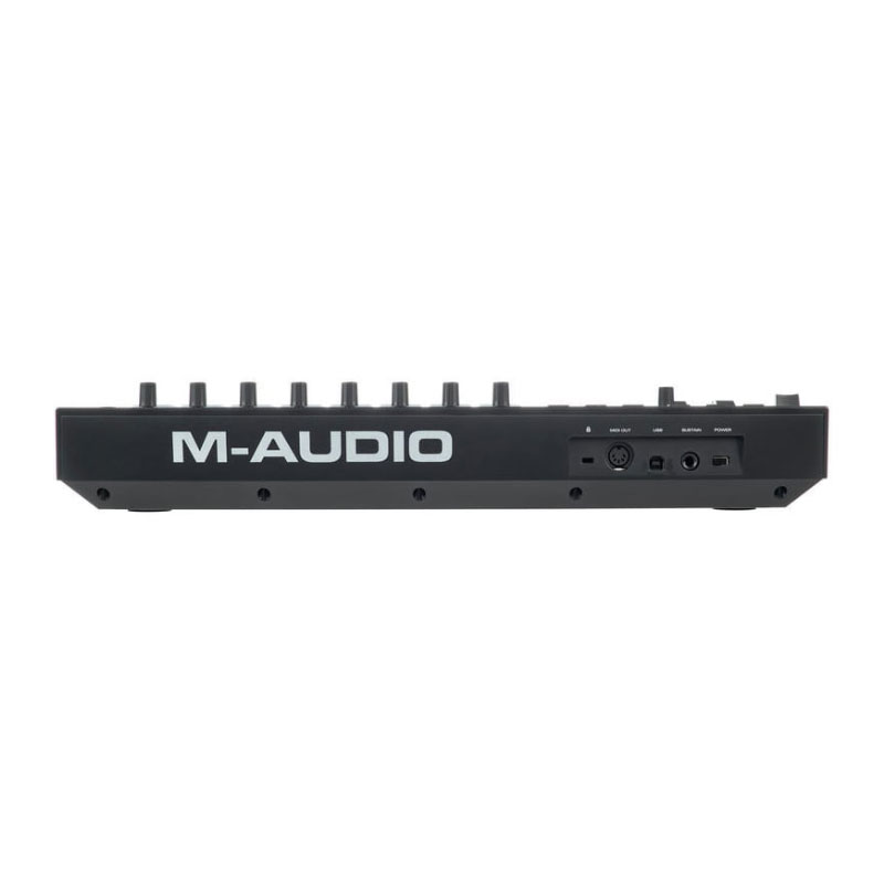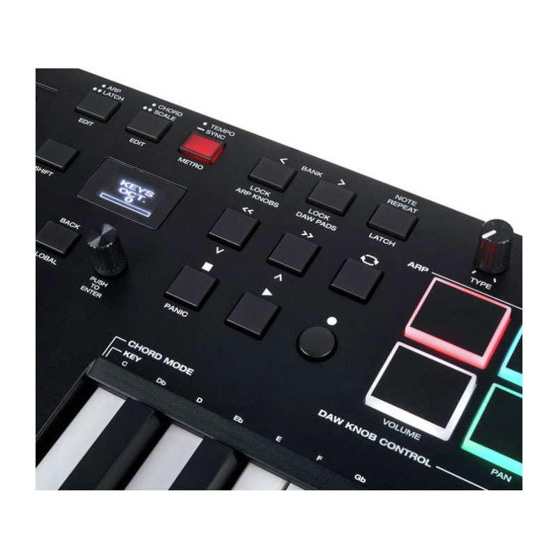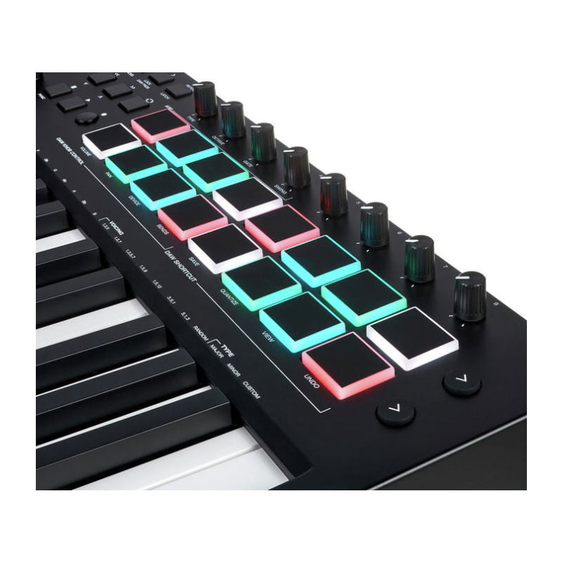 25-key MIDI Controller Keyboard with Aftertouch-sensitive Semi-weighted Keys, Assignable Zones, 8 Knobs, 16 Pads, 5-pin and USB-MIDI, USB Bus Power, and Included Software Bundle