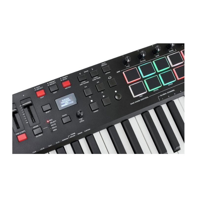 میدی کنترلر M-Audio Oxygen Pro 49 با کلاویه های نیمه سنگین حساس به velocity، با پشتیبانی از aftertouch و 16 پد حساس به velocity با نور پس زمینه ی رنگی و قابلیت Note Repeat