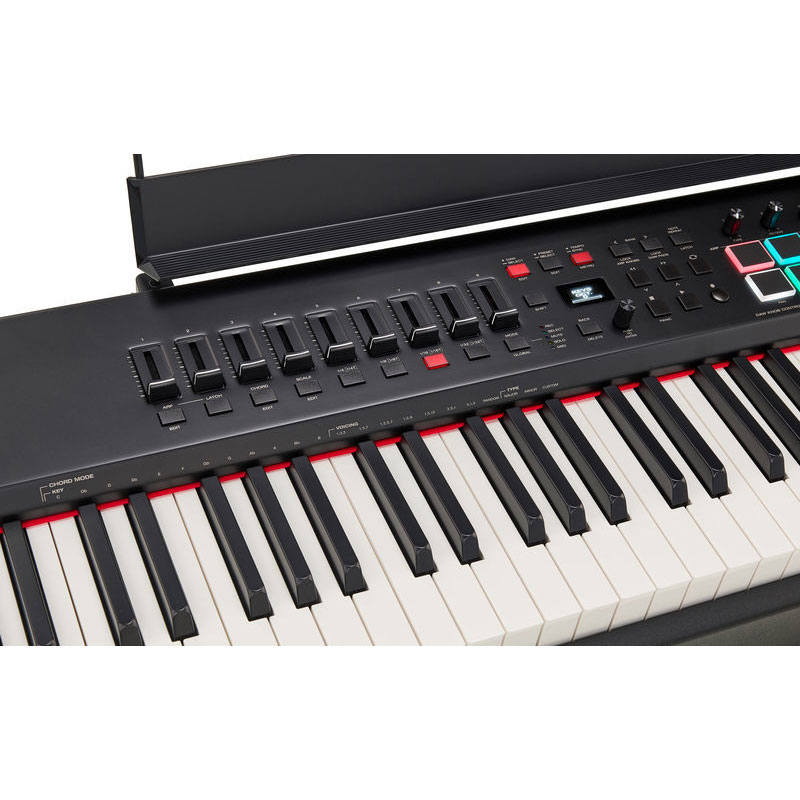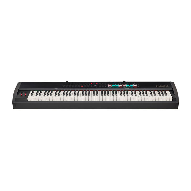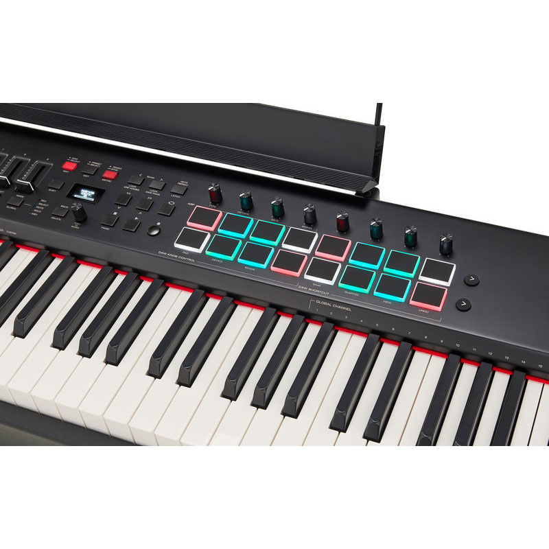 88-key USB MIDI Keyboard Controller with Hammer-action Keys, 16 RGB-backlit Performance Pads, 9 Faders, 8 Knobs, OLED Screen, Arpeggiator, 1 Expression Pedal Jack, and 3 Footswitch Jacks