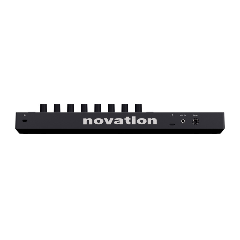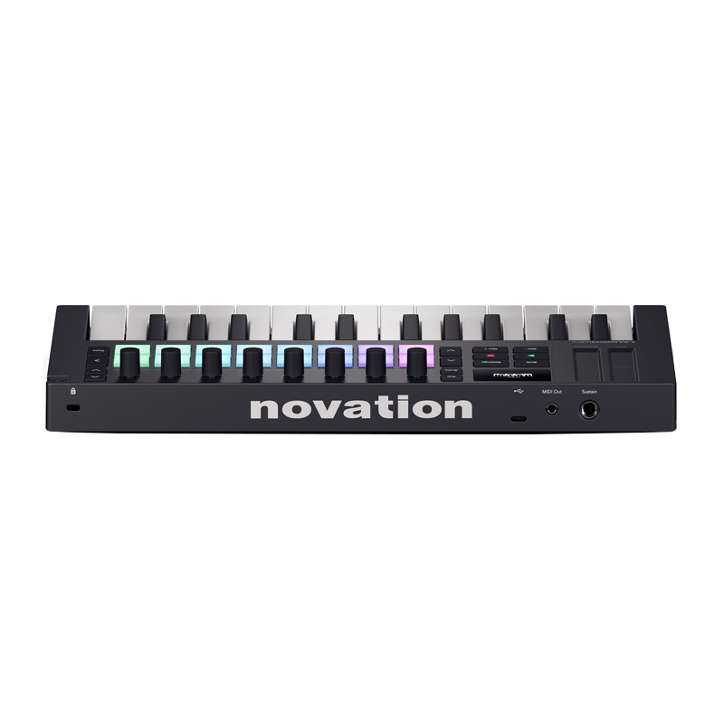 25-note MIDI Keyboard Controller with Synth-weight Mini-keys, 8 Rotary Encoders, 16 Performance Pads, 3 Chord Modes, Transport Controls, Sustain In, USB-MIDI, 5-pin MIDI Out, USB Cable, and Bundled Software