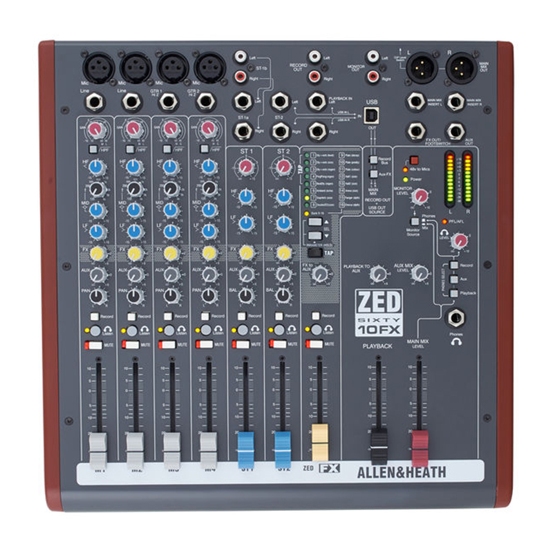 Allen & Heath ZED60-10FX فیدرهای 60 میلی متری مستحکم را به میکسر محبوب ZED-10FX اضافه کرده است. این میکسر برای گیتاریست ها ایده آل است. دوتا از چهار کانال مونوی این میکسر صدا دارای جک های ورودی با آمپدانس بالا هستند که صدای گرم و کاراکتر پری امپ های کلاسیک را به خوبی بازسازی می کنند. اکولایزر سه بانده ی این میکسر دارای ویژگی MusiQ می باشد. MusiQ پهنای باندهای اکولایزر را متناسب با تن صدای هر ساز به شکل اتوماتیک تنظیم می کند. همچنین در این میکسر به افکت های دیجیتال داخلی بسیار با کیفیت و اتصال صوتی استریوی USB برای ضبط سریع دسترسی دارید.