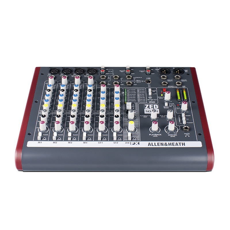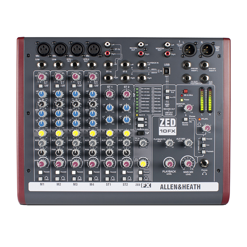Allen & Heath ZED-10FX میکسر ایده آلی برای اجرای زنده و استفاده در استودیو می باشد. ZED-10FX تمام اتصالاتی که برای یک گروه موسیقی کوچک و اجراهای سولو مورد نیاز است را در اختیارتان قرار می دهد. به لطف وجود چهار کانال mic/line می توانید تمام DI boxها و میکروفن هایی که نیاز دارید را به این میکسر صدا متصل کنید. به علاوه سه کانال dual-stereo در دسترس شما قرار گرفته که هرکدام از آن ها دارای کنترل gain و یک اکولایزر دو بانده می باشد. برای هرچه بهتر کردن صدا می توانید از افکت هایی که در این میکسر موجود است استفاده نمایید.