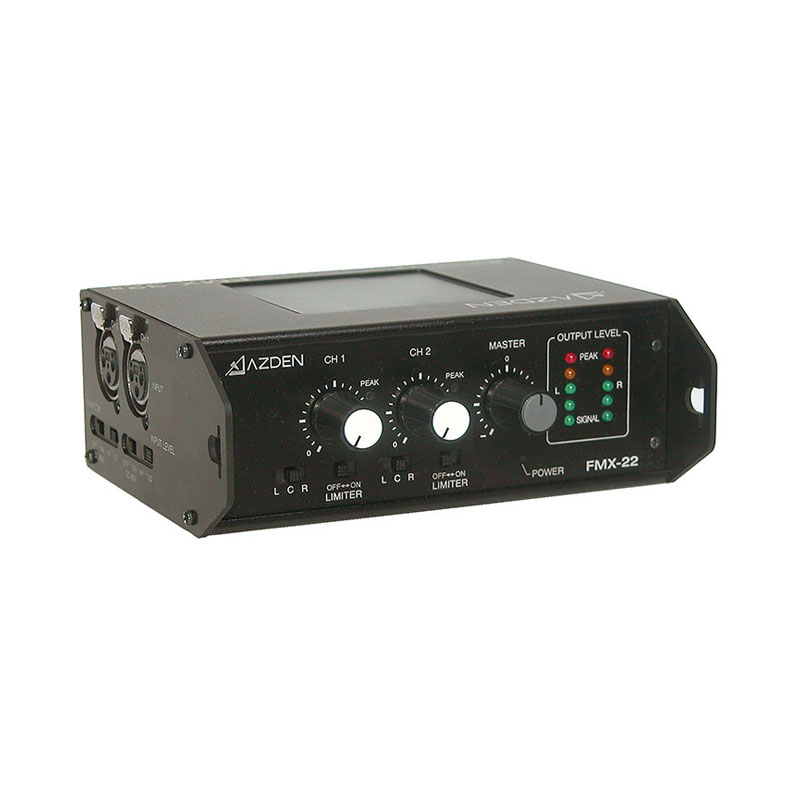 The FMX-22 Portable Field Mixer by Azden is a lightweight 2-channel battery-powered solution for any remote audio application. It features 2 XLR microphone inputs with individually switchable phantom power and two gain stages.