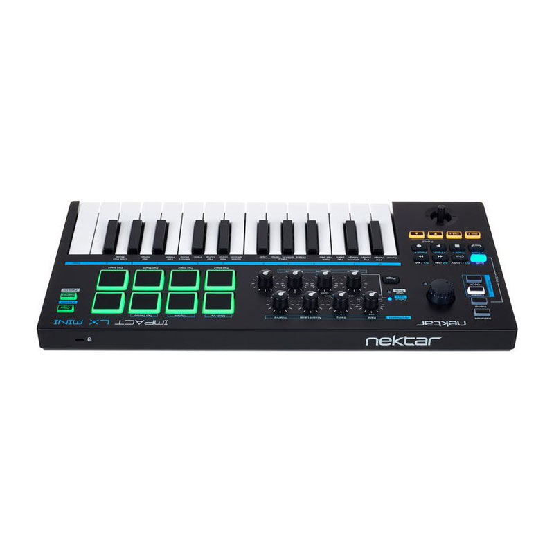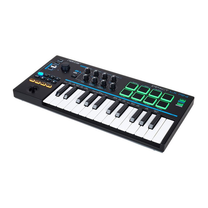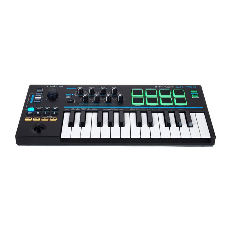 میدی کنترلر Nektar Impact LX Mini با 25 کلاویه حساس به Velocity و 8 پد درام, سوکت پدال ساستین و 7 دکمه ترنسپورت.