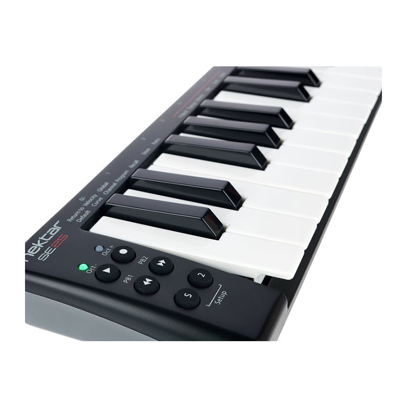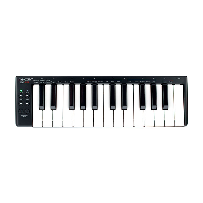 Nektar کمپانی خوش نامی است که متعهد به ارائه ی میدی کنترلرهای با کیفیت بالا، همراه با قیمت هایی فوق العاده است. میدی کنترلر Nektar SE25 کم حجم ترین میدی کنترلر این کمپانی تا به امروز می باشد. این کنترلر با وجود این که بسیار جمع و جور است، ویژگی های کاملی را در اختیار شما قرار می دهد. SE25 با داشتن ویژگی هایی مانند 25 کلاویه ی مینی حساس به velocity، سه منحنی velocity و شش دکمه ی قابل اختصاص به پارامترهای مختلف، تمام امکاناتی که برای کنترل های مورد نیاز و امکان یکپارچه شدن با نرم افزار آهنگسازی نیاز دارید را برای شما فراهم می کند. اندازه این کنترلر آنقدر کوچک است که شما می توانید آن را در کوله تان جای دهید.