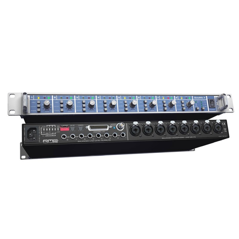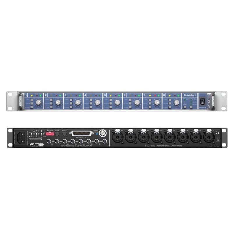 RME OctaMIc II مجموعه ای گسترده از ورودی/ خروجی ها در اختیارتان قرار میدهد. ۸ جک کمبو XLR این اجازه را میدهند تقریبا هرچیزی را که مایلید متصل کنید؛ هر چیزی از میکروفون کاندسر گرفته تا گیتار و کیبورد. و البته هر کانال مجهز به سوییچ فاز، لو-کات، و فانتوم پاور مستقل است. همچنین یک مدار ورودی بهبود یافته هدرومی بسیار بالا و محدوده Gain عالی تا ۶۰ دسیبل را فراهم کرده است. همچنین به ۸ کانال TRS بالانس-شده، خروجی دوگانه اپتیکال، و یک عدد خروجی DB-25 دسترسی خواهید داشت. خروجی دوگانه اپتیکال میتواند با تنظیمات صحیح به عنوان S/MUX تا ۹۶کیلوهرتز نیز استفاده شود.