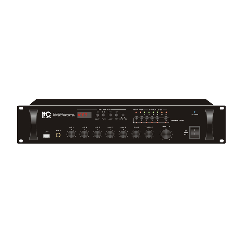 The USB mixer amplifiers have power ratings from, 60W, 120W to 240W. They are featured of three balanced microphone inputs, two aux inputs and one EMC input.