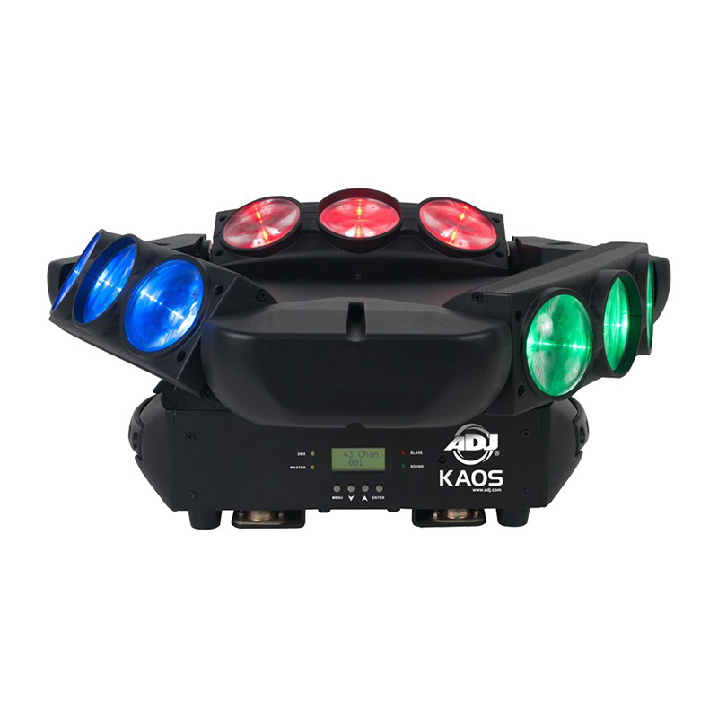 The ADJ KAOS is a centerpiece style effect that creates exciting lighting effects with it’s quick sweeping beams from three moving bars. Compatible with the ADJ UC IR remote control and the Airstream IR App.