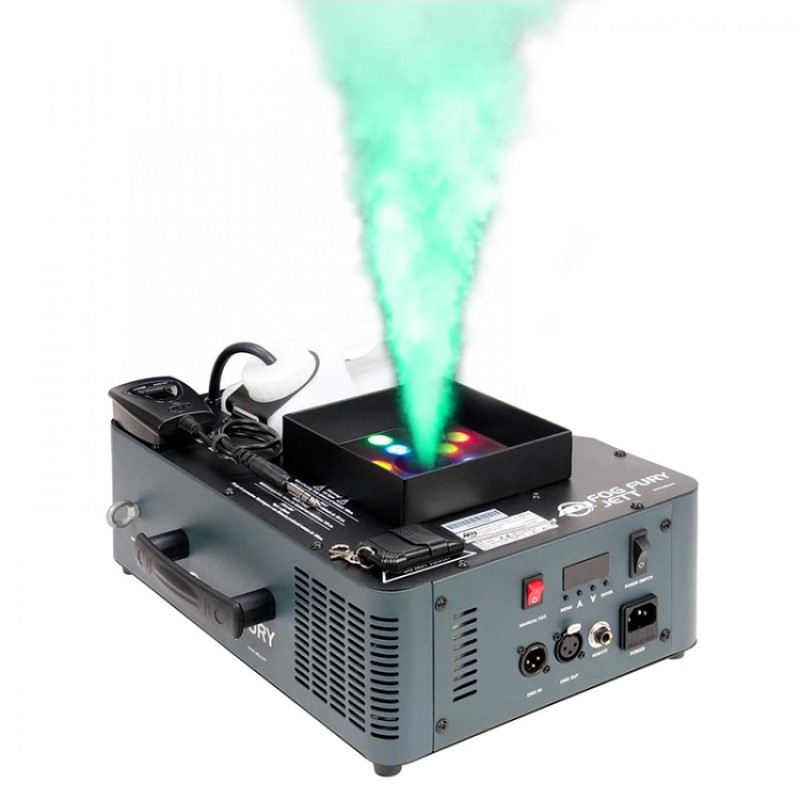 The ADJ Fog Fury Jett is a high velocity vertical Fog Machine that mixes color into the fog from 12x 3-Watt RGBA LEDs