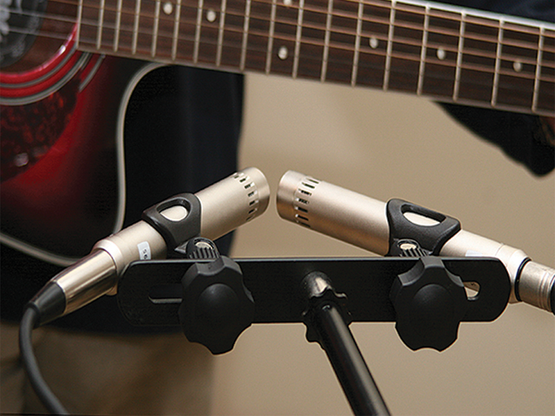 اگر برای گیتار آکوستیک نیاز به گرفتن بیشتر صدای فضا و صدای کشیده شدن انگشت ها روی سیم ها دارید، می توانید از دو میکروفن استفاده کنید. یک متود برای انجام این کار این است که یک میکروفن (کاندنسر کاردیود با دیافراگم بزرگ) را به سمت حفره ی جعبه صدا مایل کنید تا تُن های بم تر و همچنین مقداری از صدای کشیده شدن انگشتان را دریافت کند. میکروفن دیگر (کاندنسر کاردیود با دیافراگم کوچک) را به سمت فرت دوازدهم مایل کنید تا صداهای زیرتر را دریافت کند.