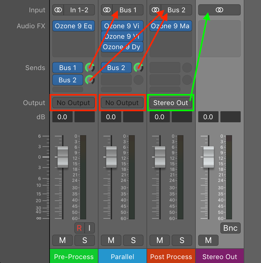 نکته: بسیار مهم است که ویژگی latency compensation (جبران تاخیر) در نرم افزار آهنگسازی شما فعال باشد. در تقریبا تمام نرم افزارهای آهنگسازی مدرن مشکلی با این مورد نخواهید داشت، اما بدون latency compensation این نوع هدایت سیگنال می تواند منجر به بروز comb filtering شود.