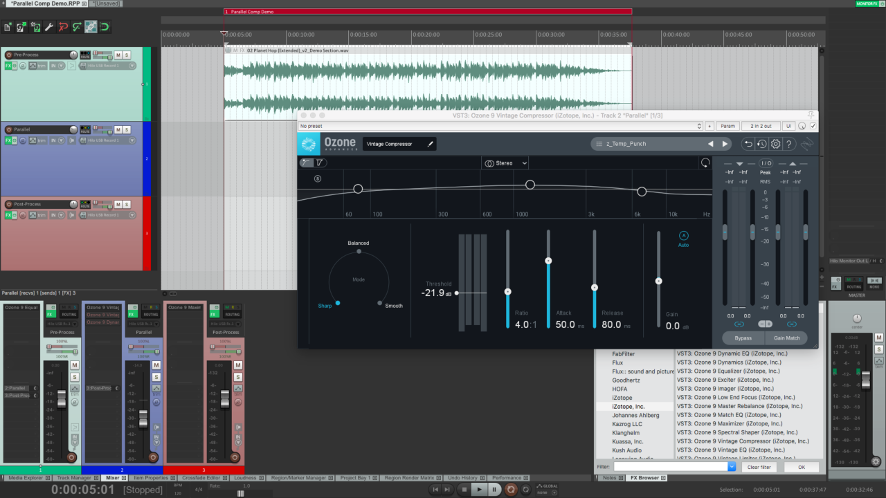 Vintage Compressor در مجموعه ی Ozone این کار را به خوبی انجام می دهد، مخصوصا در حالت “Sharp”. اگرچه نمی توان تنظیمات دقیقی که بشود برای تمام صداها استفاده کرد را پیشنهاد داد، اما چند نکته را در این رابطه برای شما توضیح می دهیم. در این مثال، هدف ما اضافه کردن پانج به kick drum است. با در ذهن داشتن این نکته تنظیمات مشخصی را امتحان می کنیم.