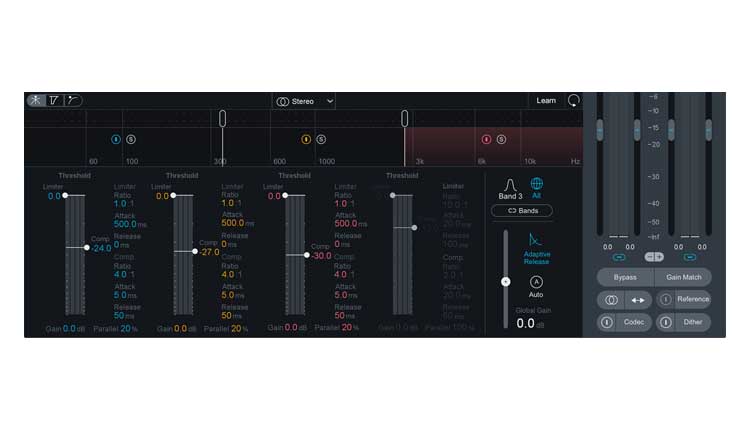 اگر تا پیش از این از چنین پردازشی استفاده نکرده اید، کار را به شکلی ساده شروع کنید. از دو یا سه باند استفاده کنید. بجای حالت Mid/Side از استریو استفاده کنید. برای هر باند از مقادیر ratio، threshold، اتک تایم و ریلیز تایم مشابه استفاده کنید.