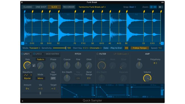 وقتی با کمبود زمان مواجه هستید، می توانید از Quick Sampler استفاده کنید که ابزاری ساده و سریع برای تبدیل هر صدایی به یک اینسترومنت می باشد. آن طور که گفته شده موزیسین ها می توانند صدایی را از Logic، Finder یا Voice Memo ها بردارند یا حتی صدا را مستقیما روی Quick Sampler ضبط کنند. با تنها چند کلیک، سمپلی در اختیار شما قرار می گیرد که می توانید آن را بخش بندی کنید و آن را به صورت لوپ درآورید؛ در این حالت با استفاده از یک کیبورد کنترلر می توانید این صدا را در طول کلاویه ها مانند یک اینسترومنت اجرا کنید. در این بخش به کنترل هایی خلاقانه برای شکل دادن و تنظیم صدا نیز دسترسی خواهید داشت.