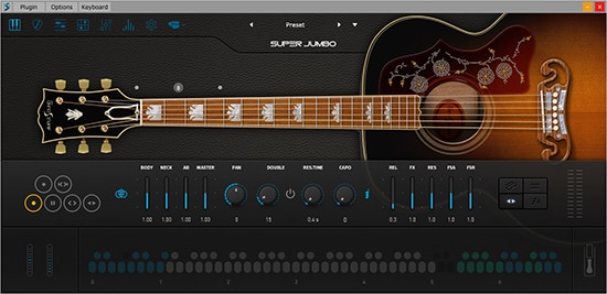 این VST در درجه اول، صدای گیتار الکترو-آکوستیک Guild D-40 را شبیهسازی میکند و بدیهیست که به عنوان یک پلاگین نرمافزاری، امکانات و قابلیتهای بیشتری نسبت ساز معمولی دارد.