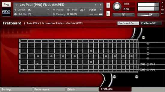 تمام قابلیتهای این VST در ۴ صفحه Performance ، تنظیمات و افکتها و Fretboard جمع شدهاند. در صفحه اول یعنی Performance ، تمام تنظیمات مهم مربوط به اجرای زنده مانند انتخاب پیکاپ گیتار، تنظیم ولوم، ویبراتو، Release و نوع نوازندگی ساز قرار داده شده است.