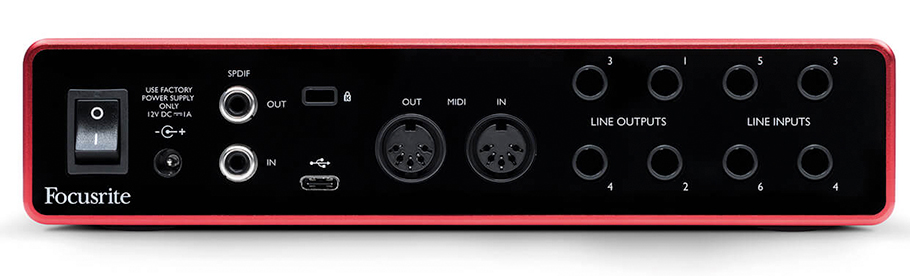 مدل بعدی، 8i6 است. این کارت صدا دارای دو ورودی کومبوی اینسترومنت و میکروفن در پنل جلو همراه با دو پری امپ میکروفن است. چند خروجی هدفون و کنترل لِول هم روی این کارت صدا وجود دارد که آن ها نیز دارای حلقه های نورانی نشانگر گِین می باشند. روی پنل پشتی ورودی/خروجی های S/PDIF، ورودی و خروجی MIDI به علاوه ی چهار ورودی دیگر برای اینسترومنت های line-level (سینتی سایزرها، درام ماشین ها و…) وجود دارد؛ به این ترتیب Focusrite با قرار دادن ورودی های MIDI و line محبوبیت روز افزون سینتی سایزرهای سخت افزاری را مد نظر قرار داده است.