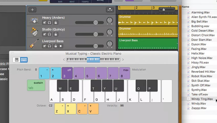 برای نمایش Musical Typing میتوانید از کلید ترکیبی Command + K یا منوی Windows استفاده کنید. برای پی بردن به قدرت پنهان Musical Typing ، روی یک Software Instrument Track کلیک کنید و سپس در قسمت Library به بخش Legacy -> GarageBand -> Sound Effects بروید و روی Radio Sounds کلیک کنید. همانطور که میبینید، روی هر کلید در پنجره Musical Typing ، یک آیکون کوچک ظاهر شده.