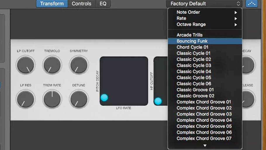 برای Track های Software Instrument دکمهای در بالا سمت راست پنجره Smart Controls وجود دارد که به وسیله آن میتوان به دهها Arpeggiator از پیش تنظیم شده دسترسی داشت. همچنین با تغییر Rate ، محدوده اکتاو و ترتیب نتها، به هزاران ترکیب متفاوت را به وجود آورد و از آنها جهت ساخت یک موسیقی خلاقانه استفاده کرد.