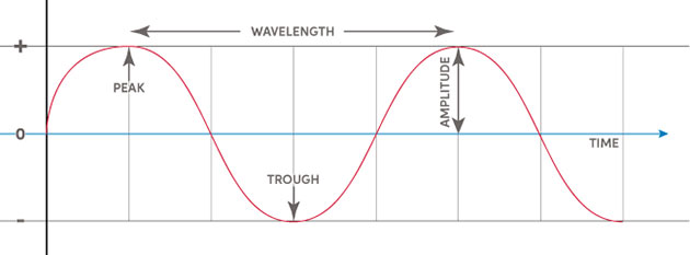Wavelength: فاصله ی بین پیک یک موج سینوسی و پیک موج بعدی.