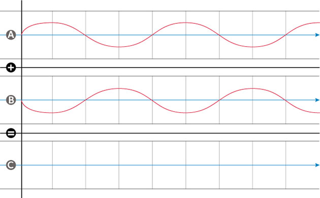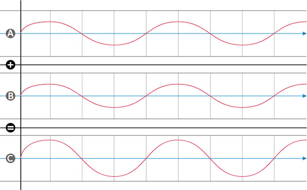 این حالت با عبارت “180 degrees out of phase,” شناخته می شود و نتیجه ی آن صدای سکوت است، چرا که هر دو موج یکدیگر را خنثی می کنند و به این ترتیب هیچ صدایی در کار نخواهد بود. در تصویر بالا موج C این حالت را نشان می دهد.