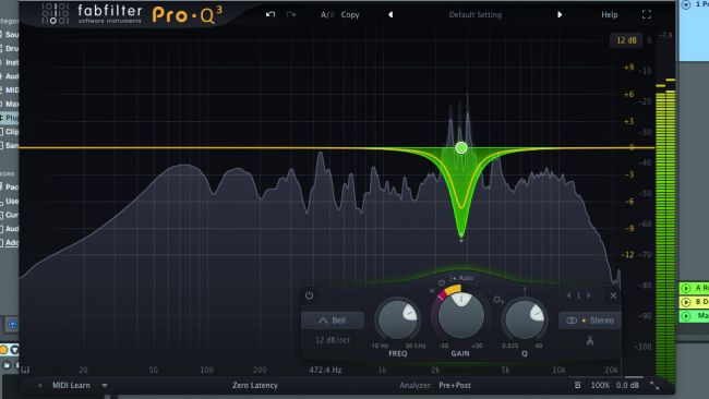 از اینجا به بعد پارامتر Q (پهنای باند) را مانند یک اکولایزر عادی تنظیم می کنیم و باند اکولایزر داینامیک را خیلی دقیق روی محدوده ی مدنظر قرار می دهیم. در آخر، با کلیک کردن روی دکمه ی Bypass Dynamics می توانید صدای سیگنال پردازش نشده را با سیگنالی که اکولایزر آن را تحت تاثیر قرار داده مقایسه کنید – تکنیکی که به شما کمک می کند نتیجه ی کارتان را بهتر ارزیابی کنید.