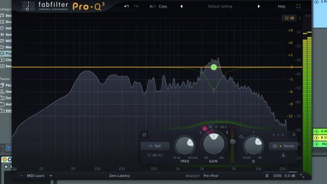در اینجا یک نمونه از پلاگین Pro-Q 3 را می بینیم که روی یک میکس استریوی کامل لود شده است. سیبیلانس (صداهای سوت مانند) ناهنجار وکال گهگاهی از میکس بیرون می زند. با حرکت دادن ماوس روی این محدوده ی فرکانسی ویژگی Spectrum Grab به ما نشان می دهد که این صدای ناهنجار بین فرکانس های 2.5 تا 3kHz اتفاق می افتد. روی این محدوده کلیک می کنیم و آن را به سمت پایین می کشیم تا یک باند اکولایزری جدید ایجاد شود و به وسیله ی آن صدای ناهنجار سیبیلانس را حذف می کنیم.