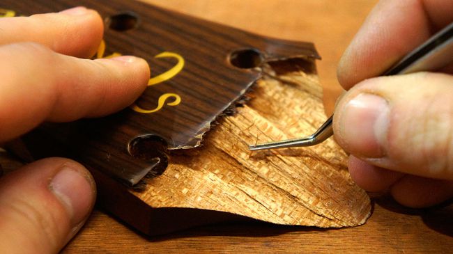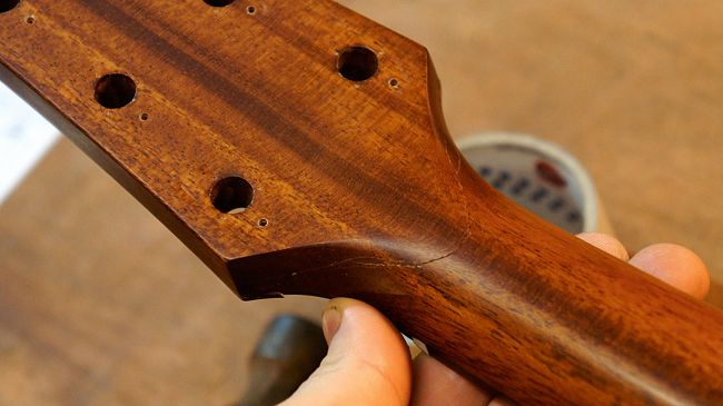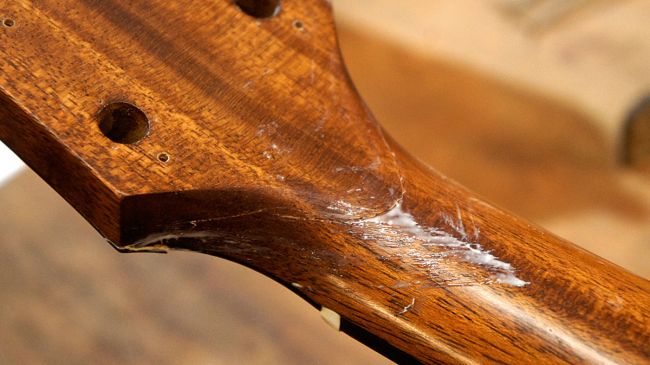 مهم ترین نکته در تعمیر شکستگی هد استاک اطمینان از جوش خوردگیِ درست محل شکستگی است. نباید بینشان شکاف یا شیار هوایی وجود داشته باشد. باریکه های چوب در صورتی که همینطور رها شوند بعداً دردسر خواهند شد. این باریکه ها (که در حدو و اندازۀ تار مو هستند) را با موچین جدا کنید. حواستان باشد به قسمت هایی که دو قسمت شکسته را به هم متصل می کند کاری نداشته باشید. مثلاً این ایده به ذهنتان نرسد که سوهان و سمباده بکشید!