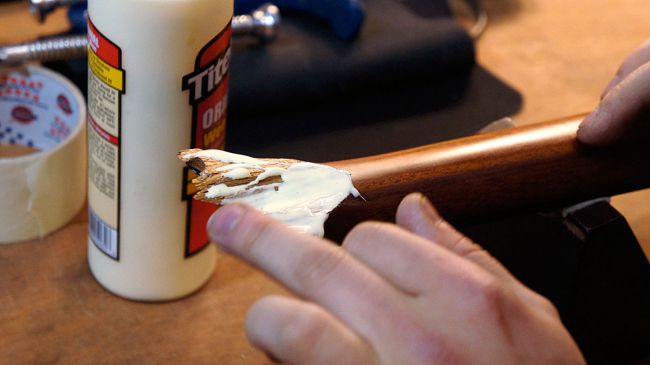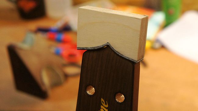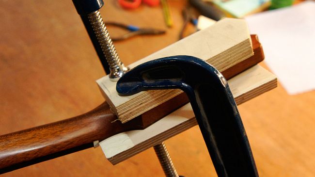 قبل از شروعِ چسب کاری، یکبار دیگر ولی با گیرۀ چوب، اتصال هد استاک را بهبود می دهیم. دو عدد چوب را ترجیحاً ابتدا با نوارچسب باندپیچی کنید (در حد یکی دو دور)، سپس در دو طرف سردسته قرار دهید و نهایتاً با گیره های G و با فشار مناسبی آن ها را تحت فشار قرار دهید. این کار باعث می شود، تا دقیقاً هد استاک در مکان خود مستحکم شود. چوب های قرار گرفته در طرفین سردسته باید اندازۀ مناسبی داشته باشند؛ نه خیلی بزرگ و نه خیلی کوچک.
