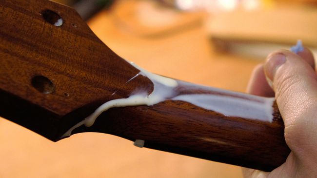 حالا قسمت حساس کار شروع می شود؛ چسب کاری! اشتباهات این مرحله بازگشت پذیر نیست؛ بنابراین با دقت کارِ خود را انجام دهید. دستمال مرطوب یا دستمالی را با آب پاش نمدار کنید و کنارتان بگذارید تا هر وقت لازم شد قسمت های اضافه چسب را پاک کنید. حالا با احتیاط چسب را به جای شکسته گیتار که سردسته روی آن قرار می گیرد بمالید. این کار را بهتر است با انگشت خود بکنید چون انعطاف و دقت بیشتری دارد. مطمئن شوید که تمام سطح شکسته را چسب مالی کرده اید.