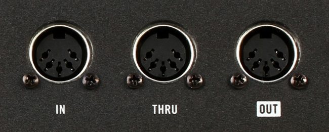 جک MIDI Thru تنها یک کار انجام می دهد – تمام اطلاعات MIDI که به جک MIDI دستگاه می رسد را دریافت و آن را به جک MIDI Thru ارسال می کند. بسیار از افراد به اشتباه تصور می کنند اگر روی این دستگاه کلاویه ها یا پدها را فشار دهند، این فشار دادن کلاویه/پدها هم از جک MIDI Thru خارج می شود. اما این طور نیست و دلیلش این است که جک های MIDI Thru تنها سیگنال ورودی را عبور می دهند – یعنی چیزی که به جک ورودی MIDI می رسد. جک های MIDI Thru چیزی که روی پنل جلوی دستگاه یا کلاویه ها فشار می دهد را اضافه نمی کنند. این ویژگی موجب می شود یک سورس MIDI clock بتواند چند دستگاه MIDI را تغذیه کند، بدون این که هر کدام از دستگاه های MIDI دستگاه بعدی که در زنجیره قرار دارد را کنترل کنند. زنجیره ی دستگاه های MIDI زمانی به وجود می آید که دستگاهی که MIDI clock را تامین می کند (همراه با فرمان های Start/Stop/Pause/Continue) دارای کابل MIDI باشد که از خروجی MIDI به جک ورودی MIDI دستگاه بعدی وصل شود. شما سپس یک کابل MIDI دیگر را به جک MIDI Thru در دومین دستگاه متصل می کنید که سپس به جک ورودی MIDI دستگاه سوم متصل می شود. شما به این روش می توانید تعداد زیادی از دستگاه ها را به حالت زنجیره درآورید پیش از آن که تاخیر ناچیزی که در هر اتصال MIDI به وجود می آید با هم جمع شوند و تاخیر قابل ملاحظه ای را به وجود بیاورند.