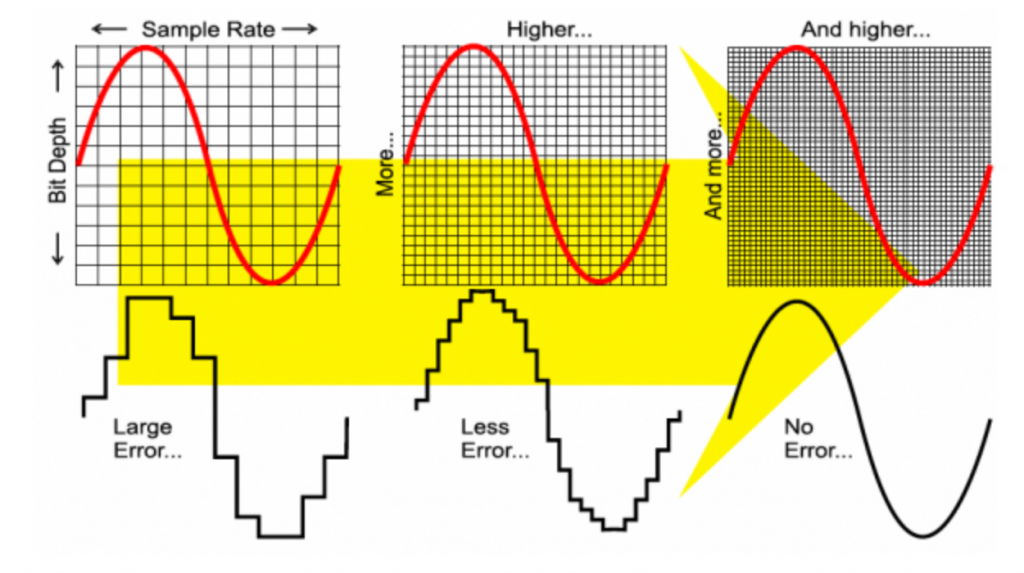 با افزایش عمق بیتی، کیفیت و رزولوشن صدا بیشتر می شود؛ چون مقادیر نزدیک تری به دامنۀ هر سمپل ذخیره می شود. نمونه برداری 24 بیتی قطعاً نوانس و جزئیات بیشتر از نمونه برداری 16 بیتی دارد. در حالت 16 بیت، می توان 2 به توان 16 لایه از اطلاعات (برابر با 65,536) ذخیره کرد و در حالت 24 بیت، 16,777,216 لایه. در واقع با بالا رفتن عمق بیت، تقریب نمونه برداری دقیق تر می شود. افزایش عمق بیت در کنار افزایش سمپل ریت، مجموعاً باعث افزایش تعداد نقاطی می شود که از روی آن بازتولید موجِ آنالوگ صورت می گیرد.