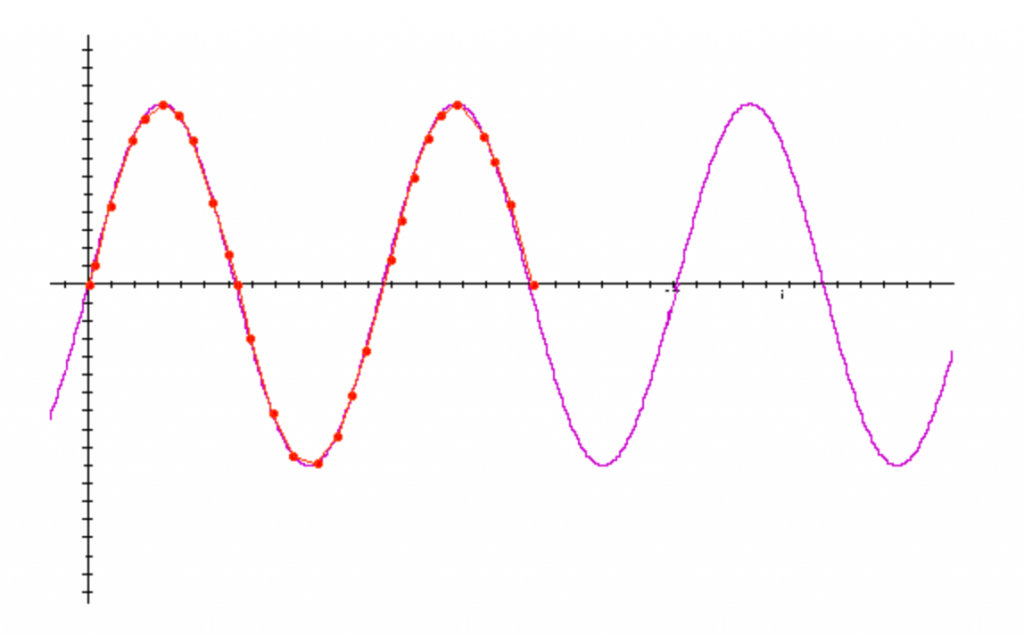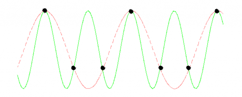 اگر به ازای هر سیکل 1.5 بار نمونه برداری کنیم، موج حاصل از اتصال این نمونه ها، بیشتر به یک موج سینوسی low frequency شبیه است.