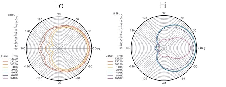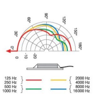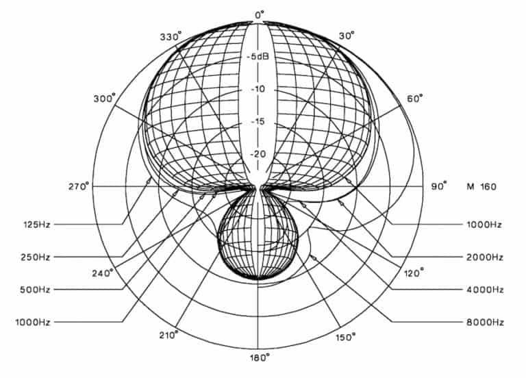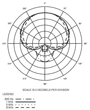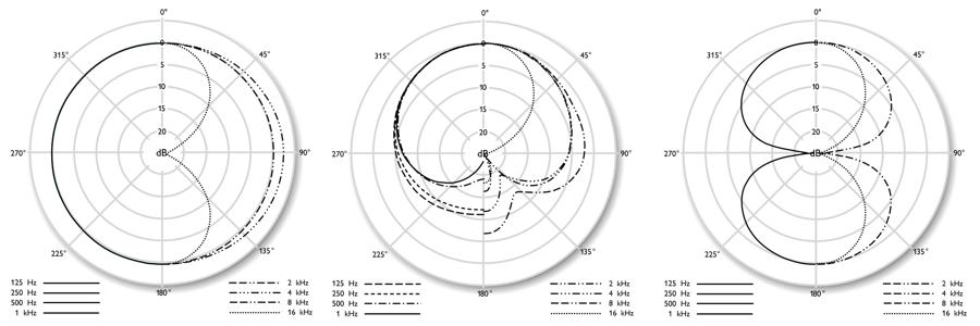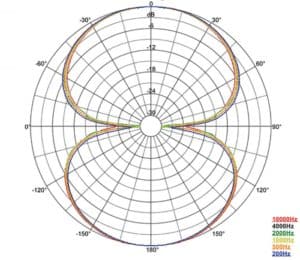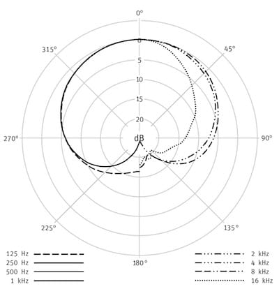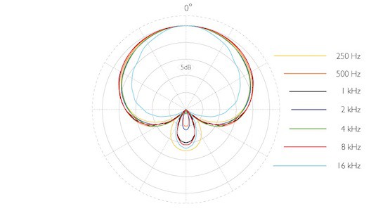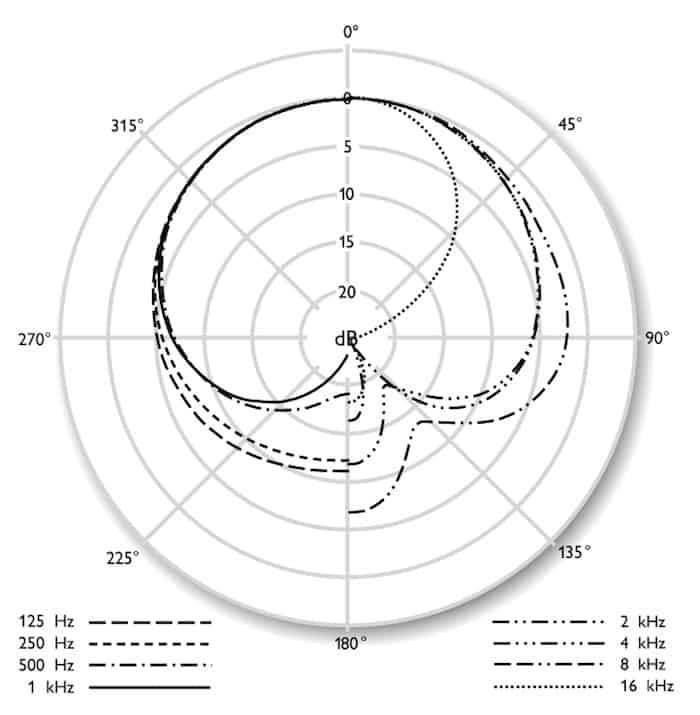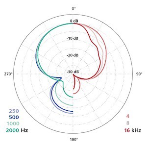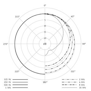 علاوه بر این، با افزایش فرکانس منبع صوتی، حساسیت میکروفن در طرفین هم کمتر میشود. در واقع حساسیت میکروفن در فرکانس ۱۲۵ هرتز، تقریبا ۵ دسیبل، در فرکانس ۱ کیلوهرتز هرتز، تقریبا ۶ دسیبل و در بازه فرکانسی ۴ تا ۸ کیلوهرتز، حساسیت آن تقریبا ۱۰- دسیبل کاهش مییابد. در نهایت با رسیدن به فرکانس ۱۶ کیلوهرتز، شاهد ریجکت کامل اصوات موجود در قسمت پشتی میکروفن هستیم.