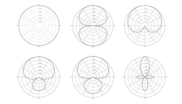در شکل بالا، ۵ الگوی قطبی Omni ، Bi-Directional ، وایدکاردیوید و هایپرکاردیوید را مشاهده میکنیم و ۴ الگوی دیگری که در دیاگرام بالا رسم نشدهاند، نقاط میانی ۵ الگوی مذکور هستند.