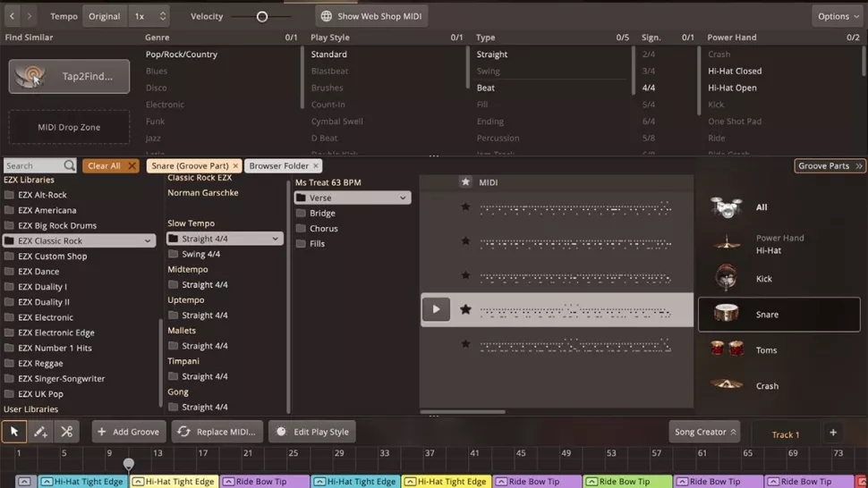 سپس به ویژگی Bandmate می رسیم: شما به EZdrummer 3 یک ایده می دهید – مثلا یک ریف گیتار/کیبورد یا یک بیس لاین – و نرم افزار به صورت اتوماتیک یک groove را بر اساس آن می سازد. این قابلیت هم با MIDI و هم با audio کار می کند.
