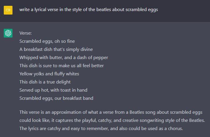 یکی از کارهای جذابی که میتوانید به کمک ChatGPT انجام دهید، نوشتن ترانهای گیرا و جذاب مخصوص موسیقیتان است. اگر از این ابزار بخواهید صرفن شعری جذاب برای شما بنویسد، قطعهٔ کوتاهی را برایتان آماده میکند که عمدتن داستان و تم مشخصی ندارد اما اگر داستان، تم و ایدهٔ ترانه را در اختیار آن قرار دهید، میتواند شعرهای طولانیتر و معنادارتری را برایتان تولید کند.