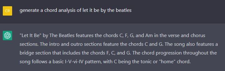 اگر انجام این کارها برایتان سخت است، توصیه میکنیم به کمک ابزارهایی مثل Ultimate-Guitar قسمتی از موسیقی مورد نظرتان را در قالب متن به ChatGPT بدهید و از این ابزار بخواهید تا ادامهٔ قطعه را بر اساس الگوی آهنگ اصلی، برایتان تکمیل کند. توجه داشتهباشید که ChatGPT برای اولین بار در عمرش میخواهد برای شما آهنگسازی کند و بنابراین ممکناست اشکالاتی داشتهباشد اما فارغ از این اشکالات نادر، هنوز هم ChatGPT پتانسیلهای زیادی برای کمک به ما در انجام آهنگسازی دارد.