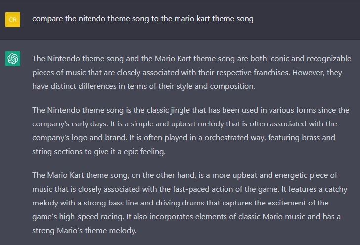 یکی از پرکاربردترین و حرفهایترین کارهایی که ChatGPT میتواند بهخوبی از پس انجام آنها بر آید، تجزیه و تحلیل موسیقی است. با استفاده از این ابزار قدرتمند میتوانید فرمهای مختلف موسیقی در قالب فایلهای XML، میدی، نُت و … را مورد تجزیه و تحلیل قرار دهید. ChatGPT با مطالعهٔ سریع موسیقی که در اختیارش قرار دادهاید، میتواند ضمن خلاصهکردن آن، نظراتش نسبت به قطعهٔ مذکور را برایتان بنویسد یا آن را با قطعات دیگر مقایسه کند! یکی از موارد سواستفاده از ChatGPT، خواستن نقدهای منفی آن نسبت به آهنگ گروهی است که از آن تنفر دارید 🙂